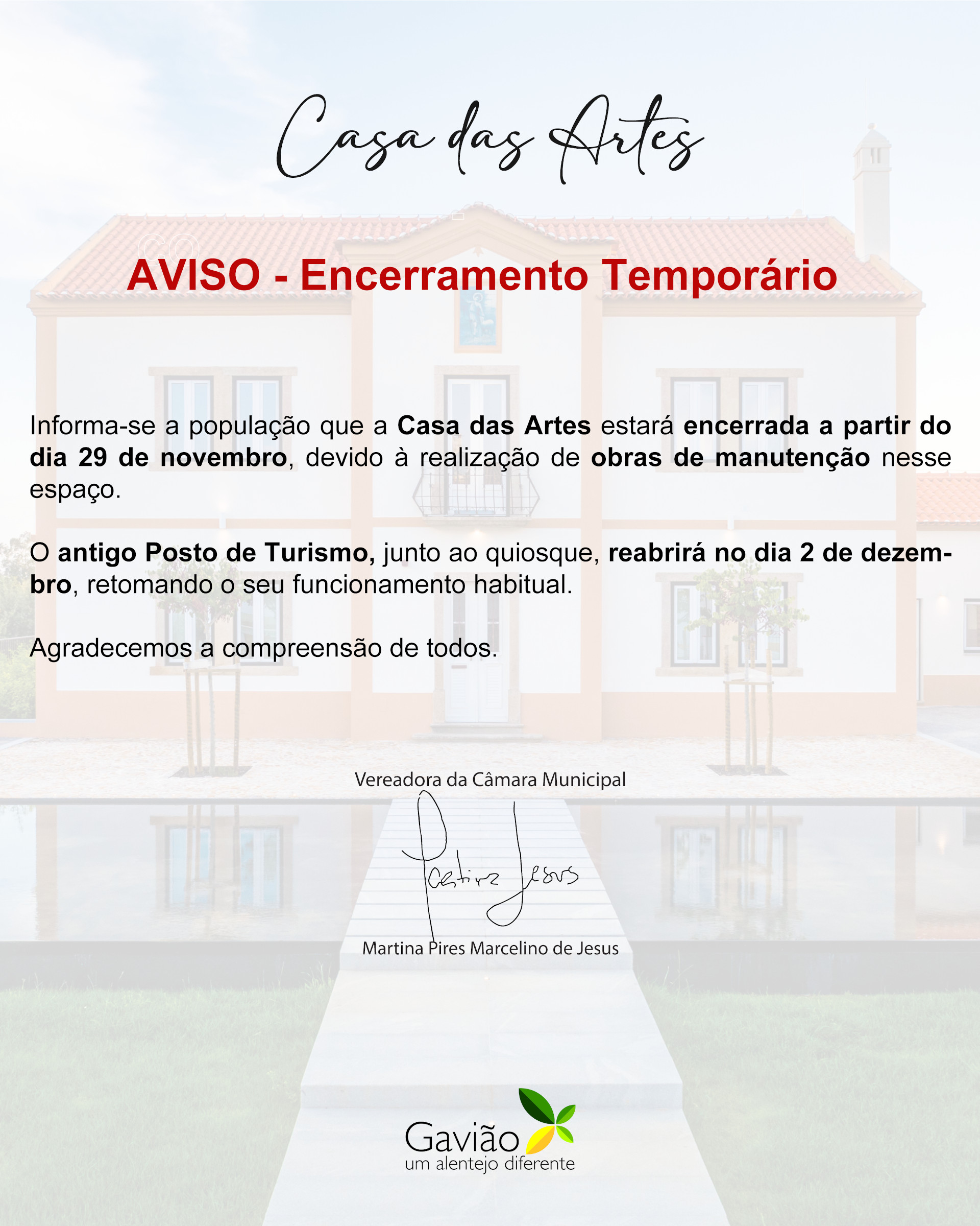 Casa das Artes estará encerrada a partir do dia 29 de novembro