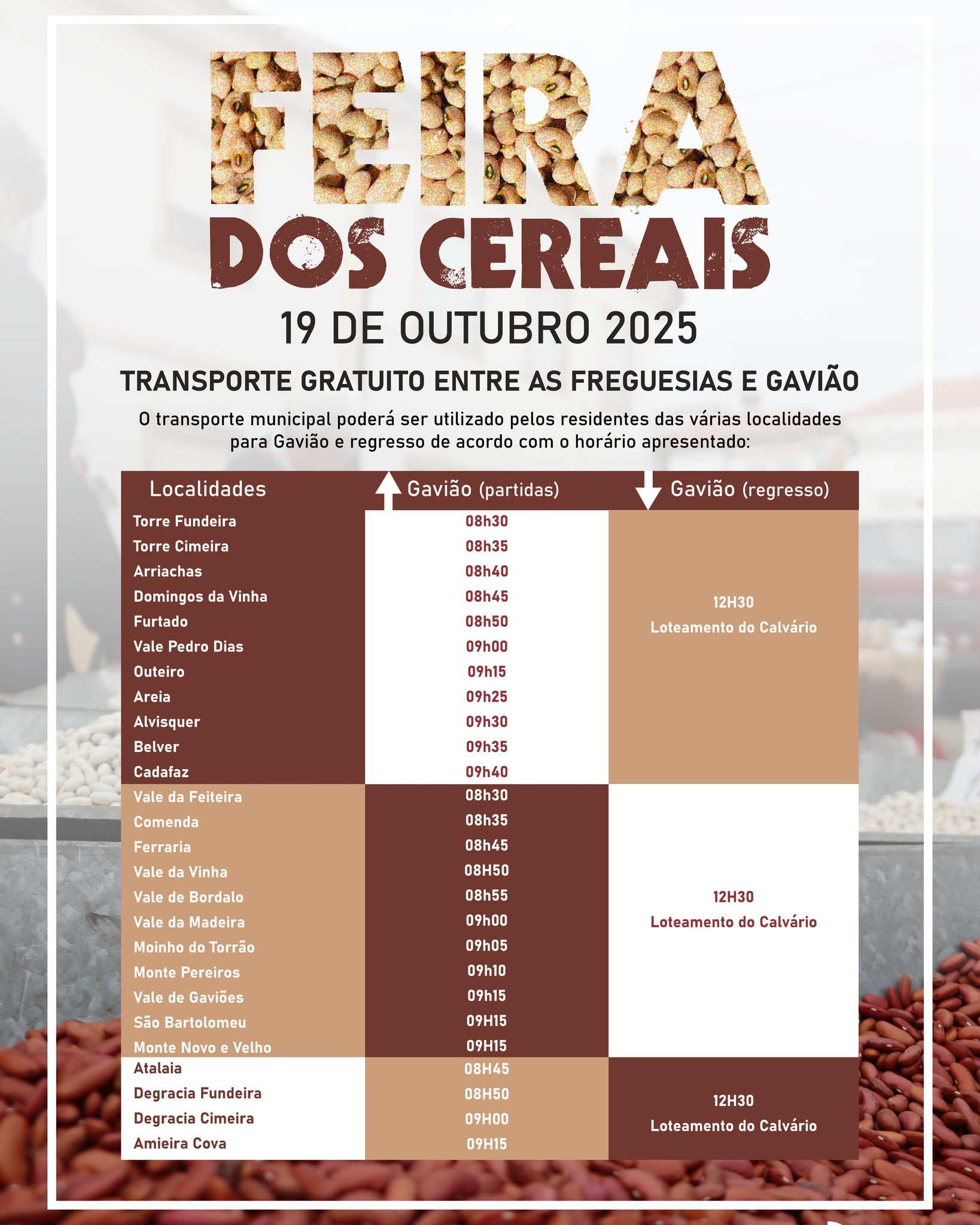 Transporte Gratuito nas Freguesias para a Feira dos Cereais 2025 ππ«πππ’ππ’π¨π§ππ₯ π ππ’π«π ππ¨π¬ πππ«πππ’π¬ ππ πππ―π’πΜπ¨ π 19 DE OUTUBRO DE 2025 π HorΓ‘rios do transporte gratuito Anterior NotΓcia anterior